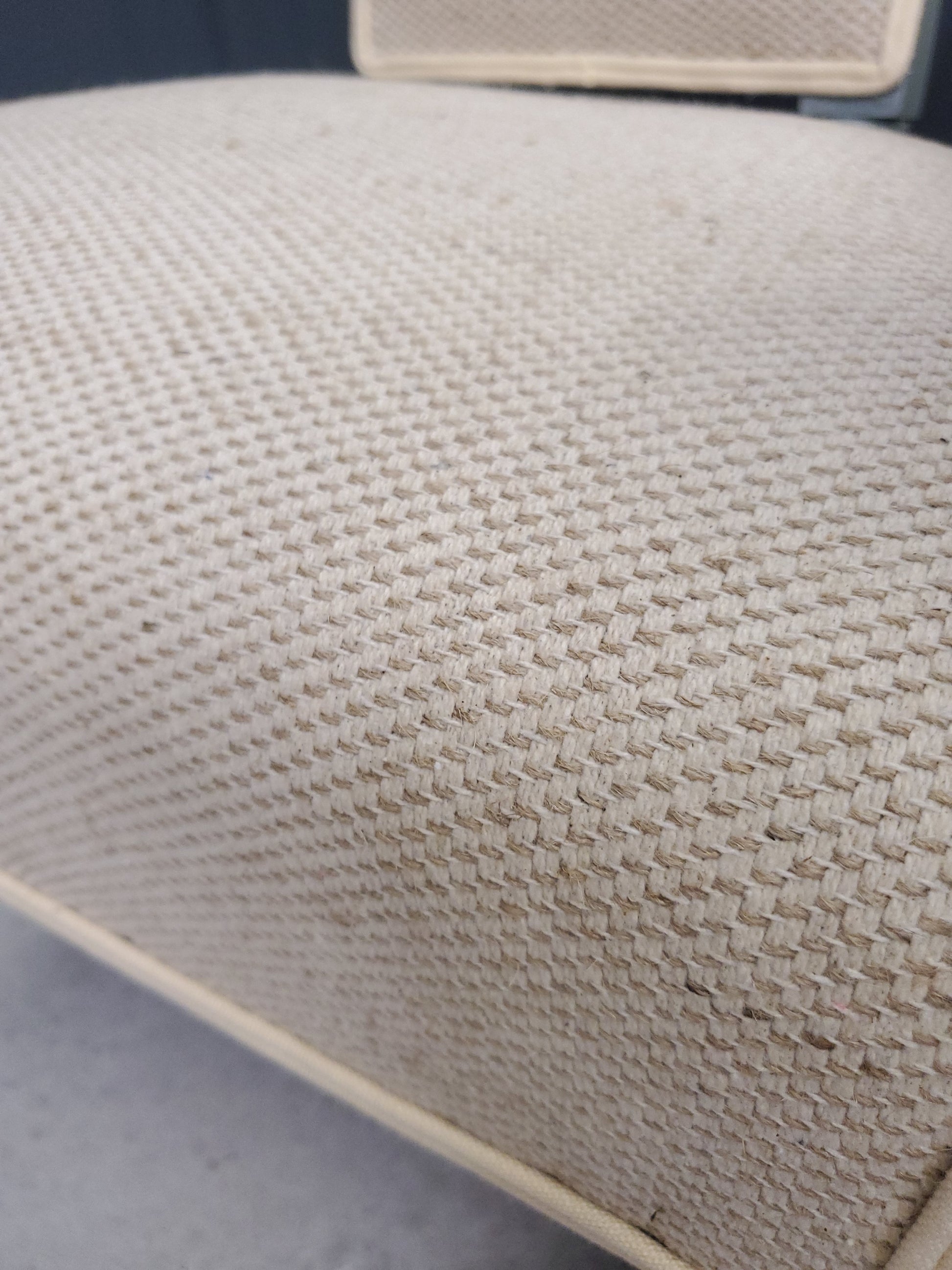 L’assise a été entièrement re sanglée, regarnie et retapissée dans un tissu texturé de ton naturel et intemporel (50% lin, 50% coton)
