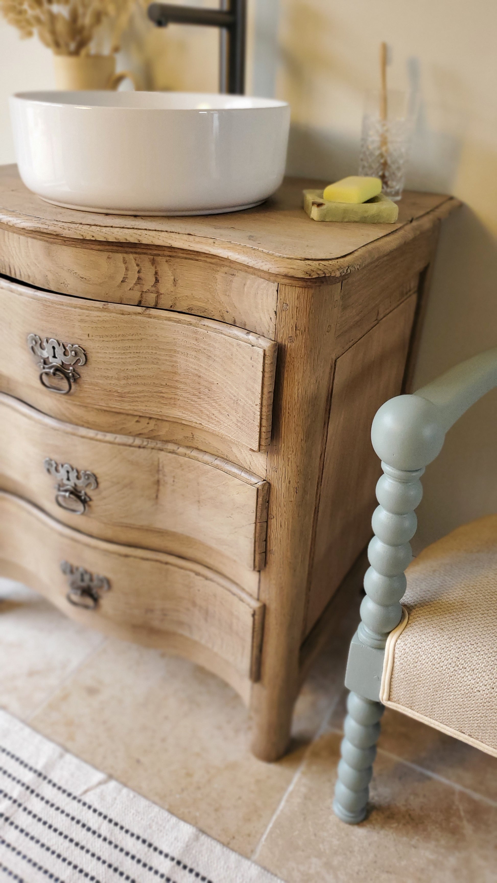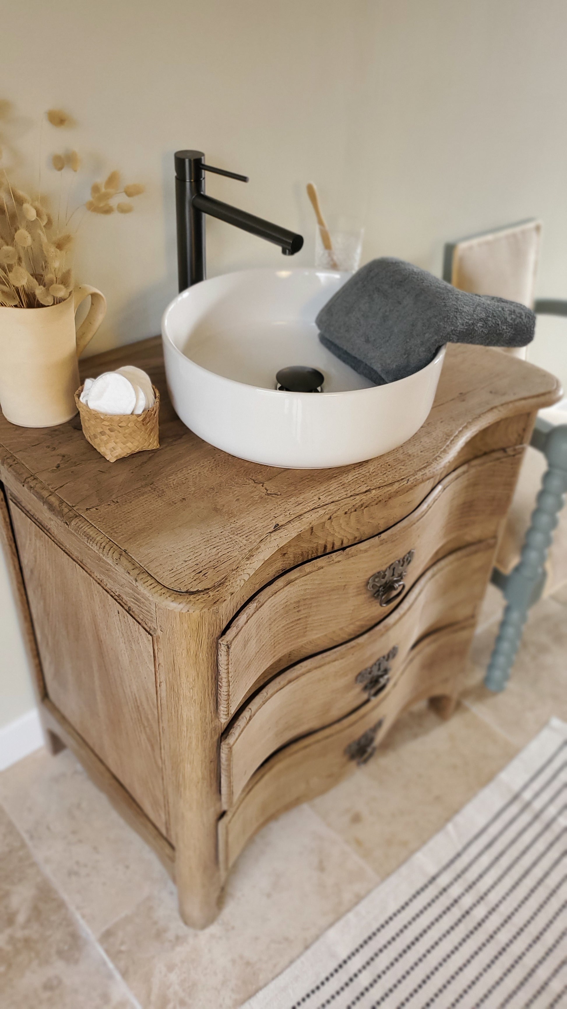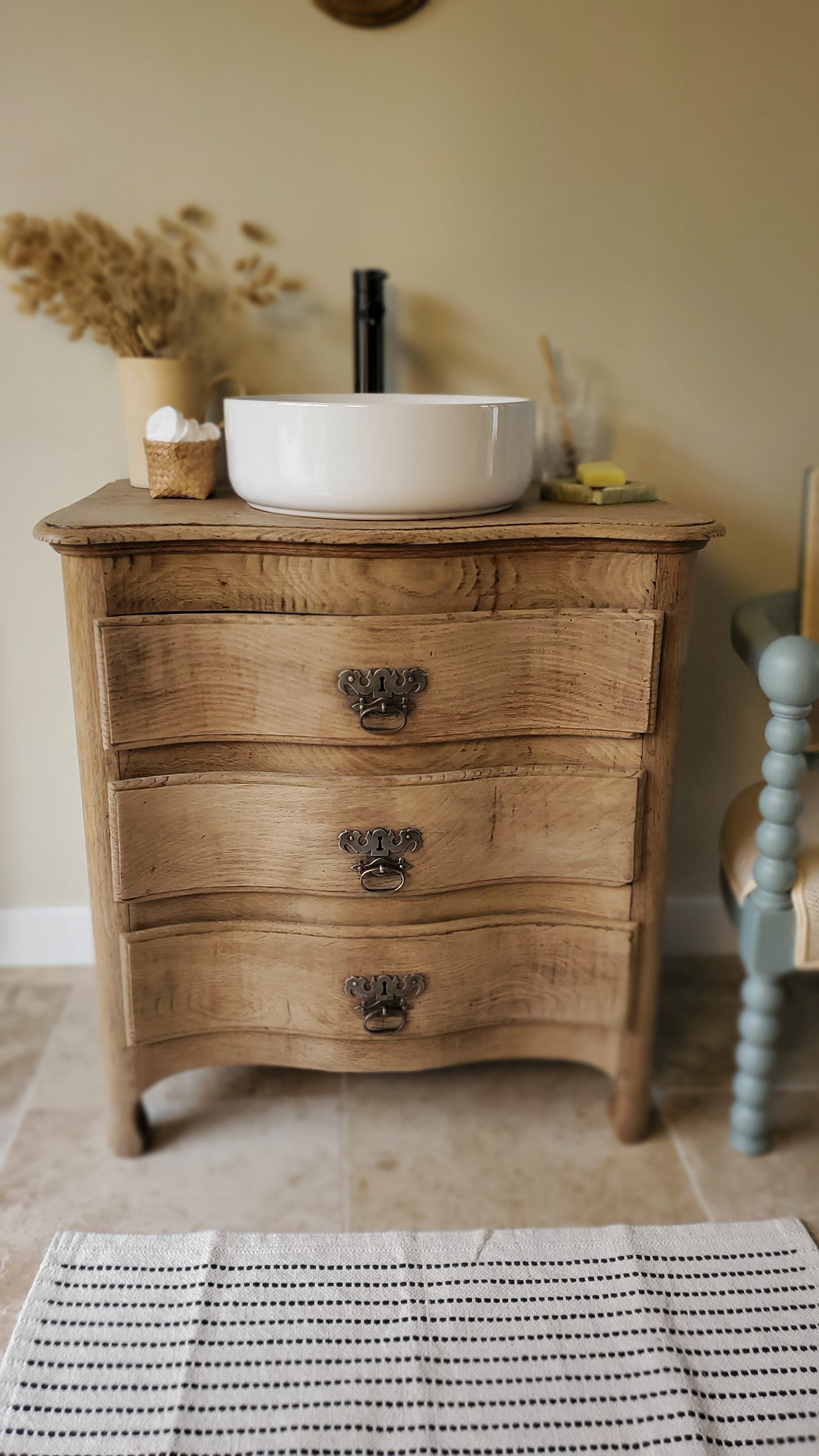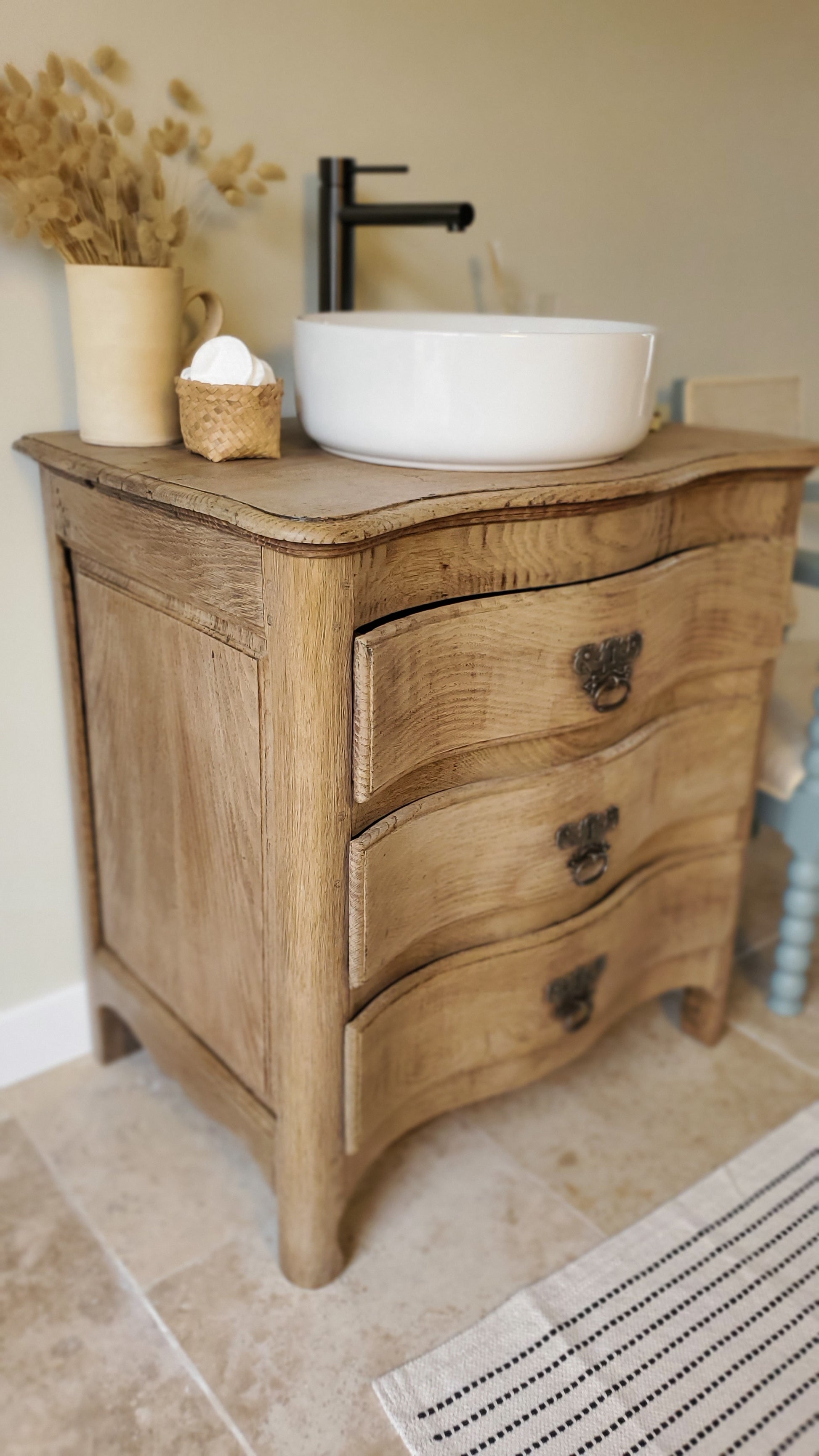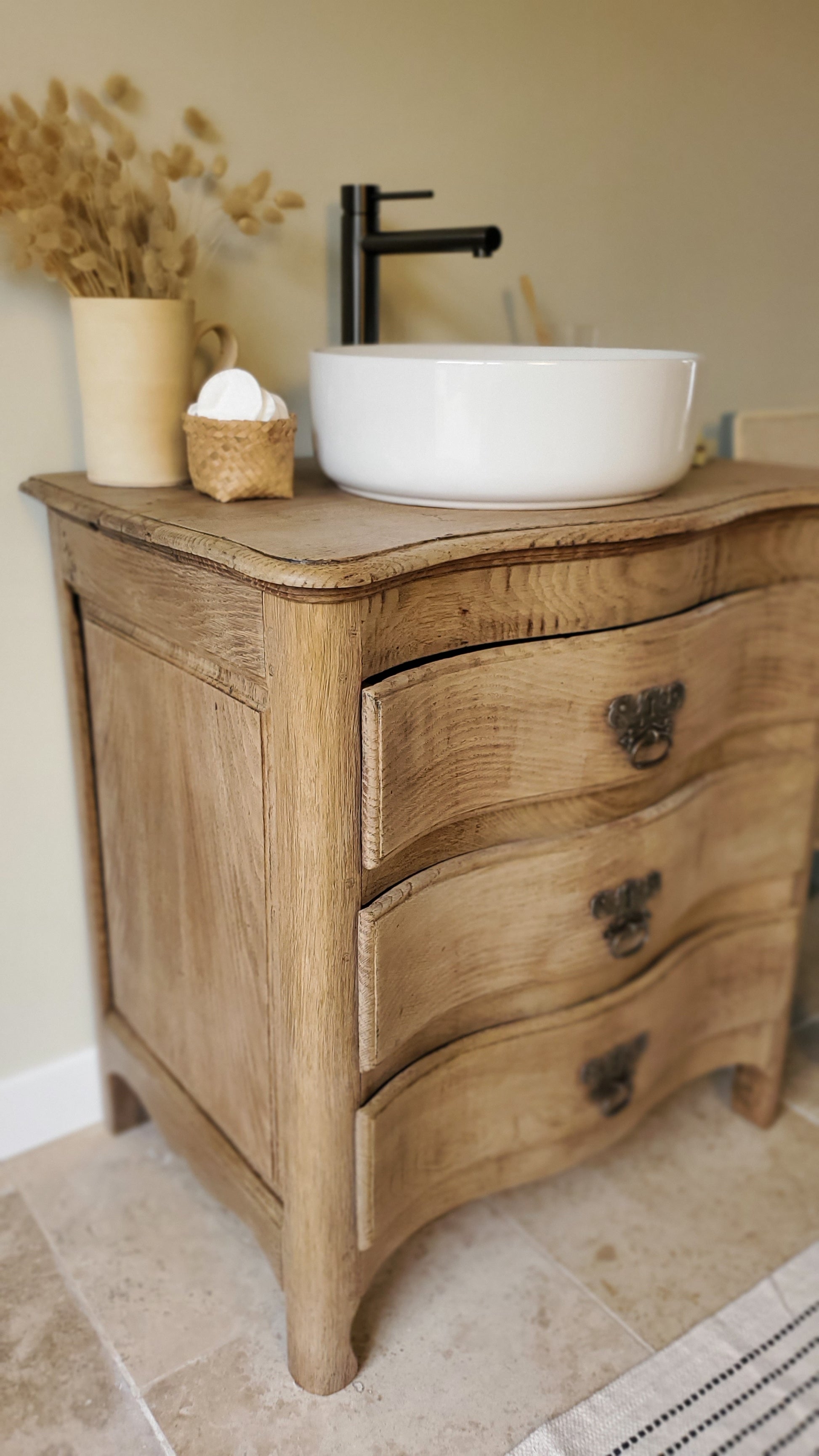 Petite commode en chêne massif transformée en charmant meuble de salle de bain.